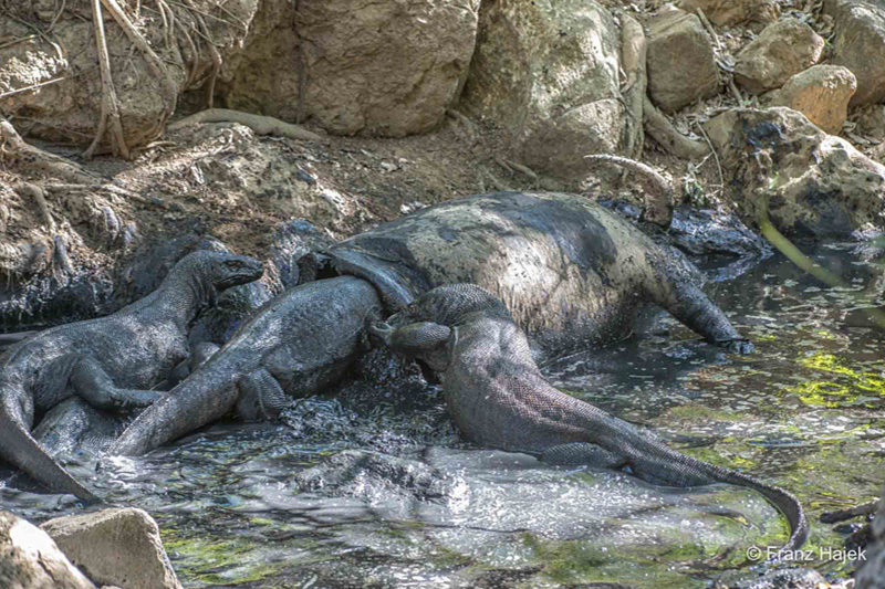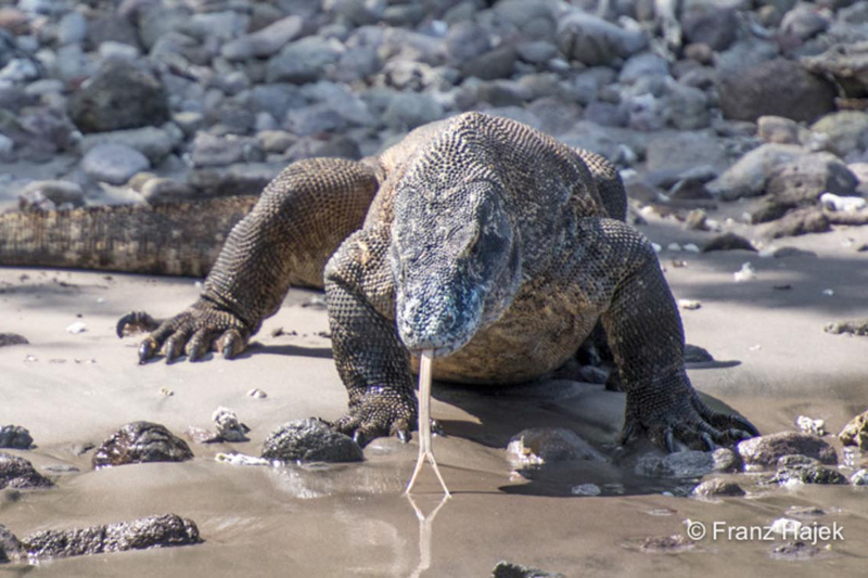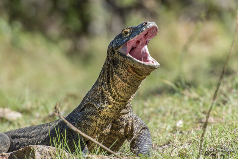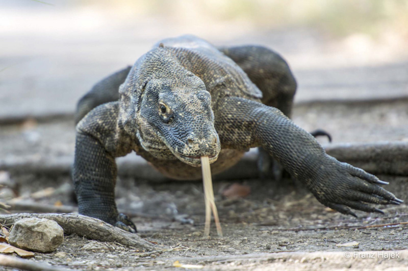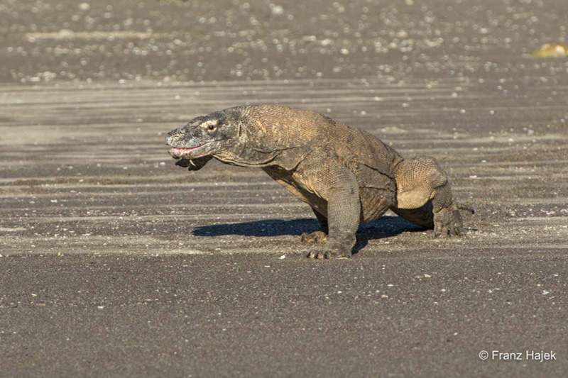 Der Komodowaran, die größte lebende Echsenart, ist auf den indonesischen Inseln Komodo, Rinca und einigen benachbarten Inseln beheimatet. Diese beeindruckenden Reptilien können bis zu 3 Meter lang werden und ein Gewicht von über 70 Kilogramm erreichen. Sie sind bekannt für ihre imposante Größe, kräftigen Klauen und ihren starken Biss, der nicht nur bakterielle Infektionen, sondern auch ein potenziell tödliches Gift enthält. Dieses Gift hemmt die Blutgerinnung und senkt den Blutdruck der Beute, was ihre Jagderfolge sichert.