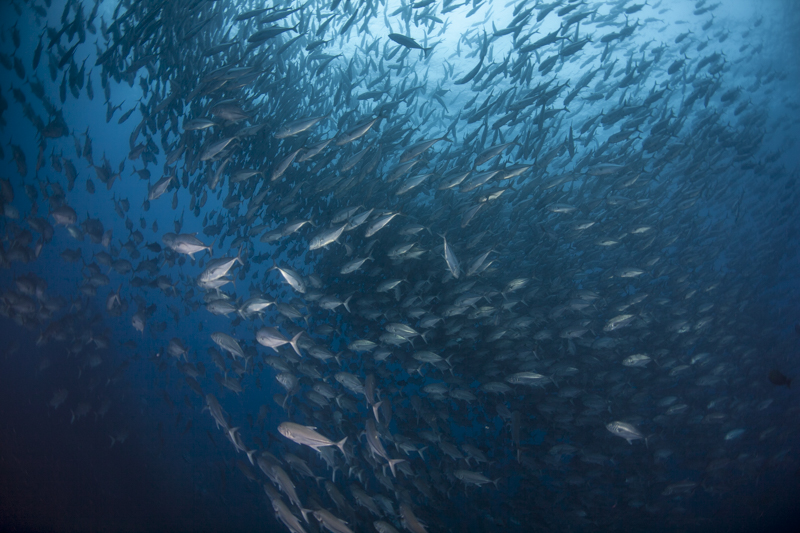 Wer aber Glück hat, erlebt auf Malpelo mehr Leben als an den meisten anderen Ecken der Welt. Hunderte Seidenhaie, Walhaie, große Muränen die büschelweise aus den Löchern quellen und legendäre Hammerhaischulen machen den Ruf von Malpelols als mega Großfischdestination aus ...