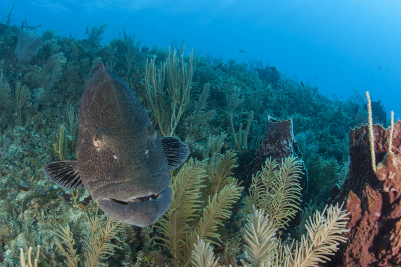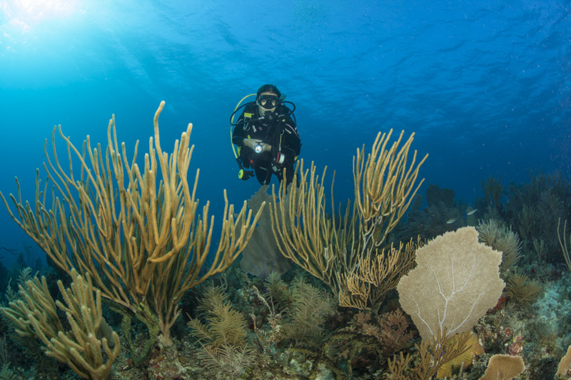 Hier dominiert die typische karibische Unterwasserwelt mit ihren Schwämmen, Farnen und typischen Bewohnern.