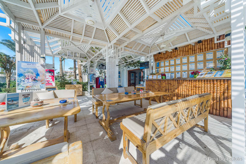 Der älteste ORCA Dive Club ist bestens ausgestattet, offener Empfangsbereich mit Check-in-Schalter, moderne Schulungseinrichtungen, luftige Trockenräume für Gästeequipment, Tec Workshop, Aufbewahrungsräume für Rebreather Units, einer allseits beliebten Taucherbar mit herrlichem Blick über den Strand und den Steg.
