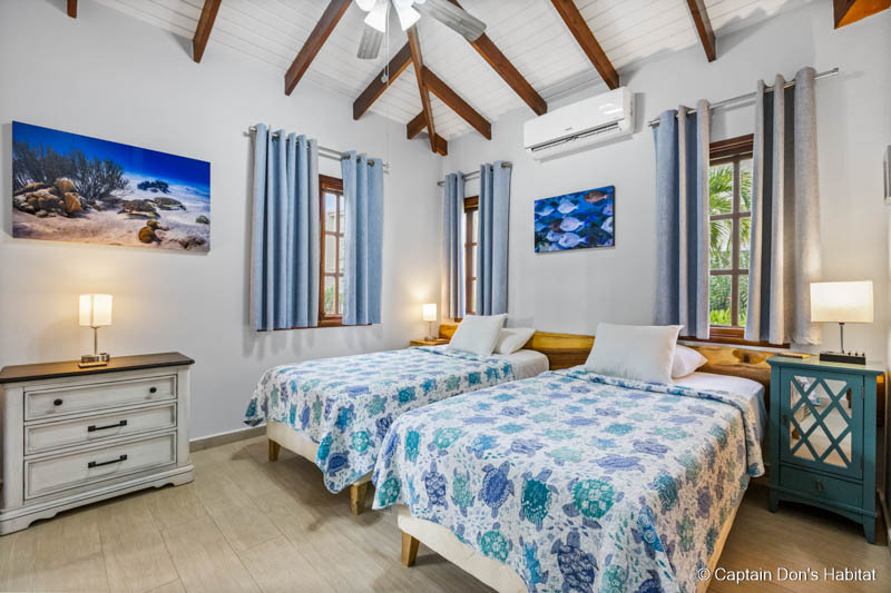 Die Ocean Front Villen sind 3-Schlafzimmer-Villen mit Meerblick und verfügen über eine voll ausgestattete Küche, ein Wohnzimmer, ein separates Schlafzimmer, ein Badezimmer mit Haartrockner, eine überdachte Terrasse mit herrlichem Blick auf das Karibische Meer und Klein Bonaire im Erdgeschoss und entweder 2 oder 3 Schlafzimmer, jedes mit eigenem Badezimmer im Obergeschoss, und sind voll klimatisiert. Darüber hinaus verfügt jedes der Schlafzimmer im Obergeschoss über einen kleinen Kühlschrank und einige haben einen Balkon mit Meerblick. Jedes ist geschmackvoll im karibischen Stil eingerichtet und verfügt über Deckenventilatoren und Kabelfernsehen.