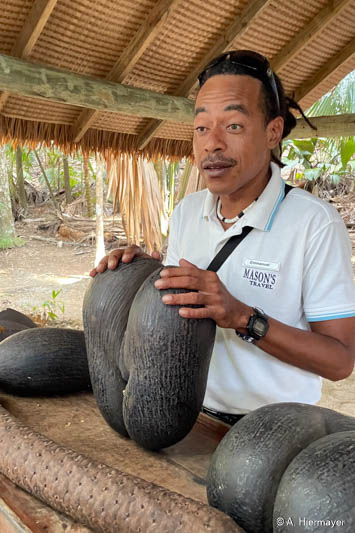 Auf Praslin nahmen wir an einer zweistündigen, sehr informativen Tour durch das Vallée de Mai mit Emmanuel von Masons Travel teil, der fließend Deutsch spricht. Der Strand Cote d’Or ist lang, mit feinem, hellem Sand, wird aber nicht gereinigt. Es lag etwas Seegras, aber kaum Müll. Entlang der parallel verlaufenden Straße gibt es kleine Shops, Bars, einen Supermarkt und einen Geldwechsel-Schalter.